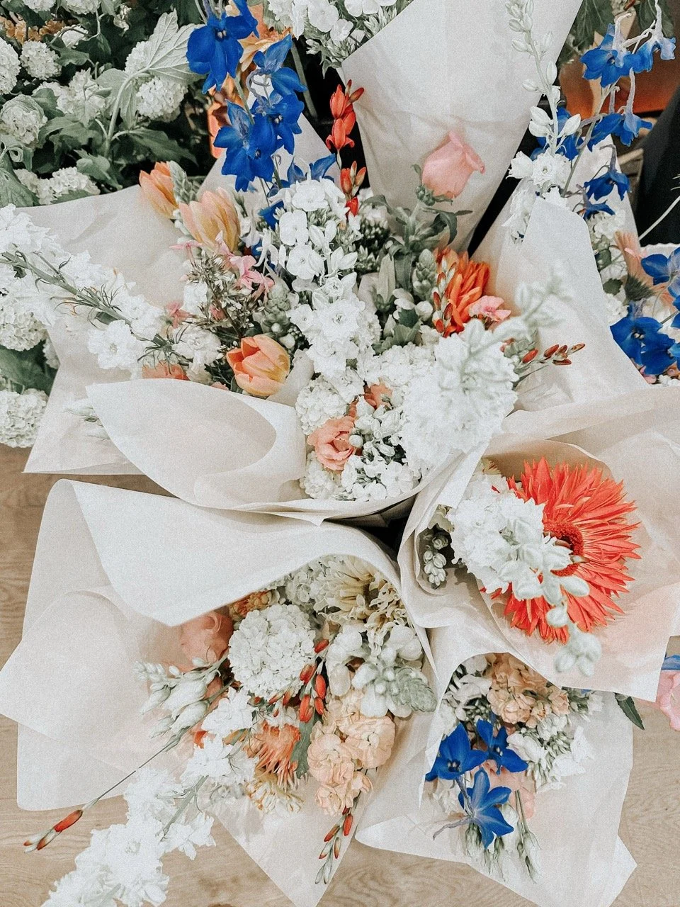 Unsere Florist:innen bringen alles mit: von Vasen & Seidenpapier bis zu gebrandeten Flower Bags. Alles inklusive.